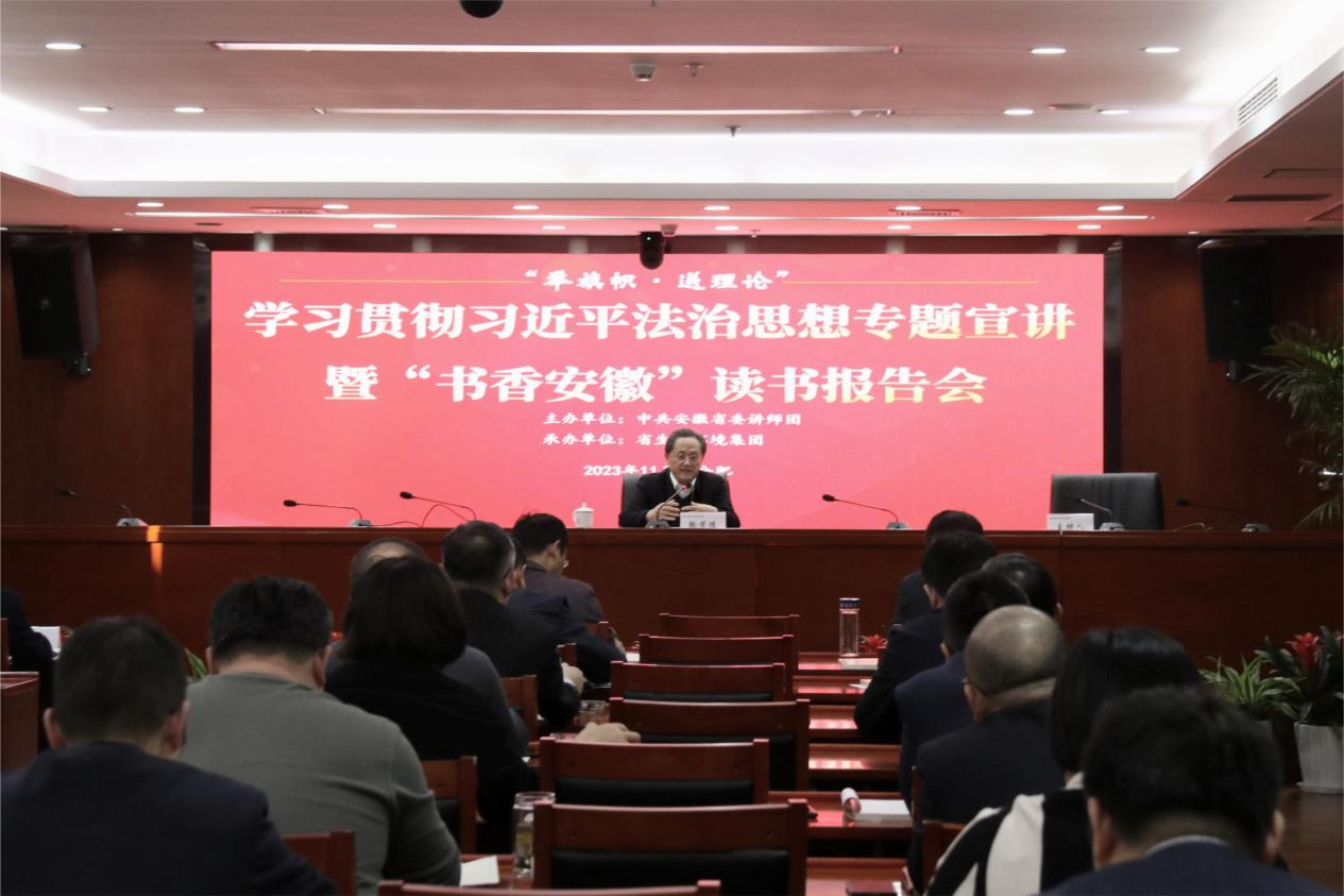 11月23日下午,省委講師團“舉旗幟·送理論”學(xué)習(xí)貫徹習(xí)近平法治思想專題宣講暨“書香安徽”讀書報告會走進省生態(tài)環(huán)境集團。報告會邀請省人民檢察院黨組成員、副檢察長、一級高級檢察官陶芳德作專題宣講報告。集團公司黨委及經(jīng)營班子成員,各直屬(控股)公司主要負責(zé)人、法務(wù)合規(guī)工作分管領(lǐng)導(dǎo)及部門負責(zé)人,集團本部中層及以上管理人員參加報告會。